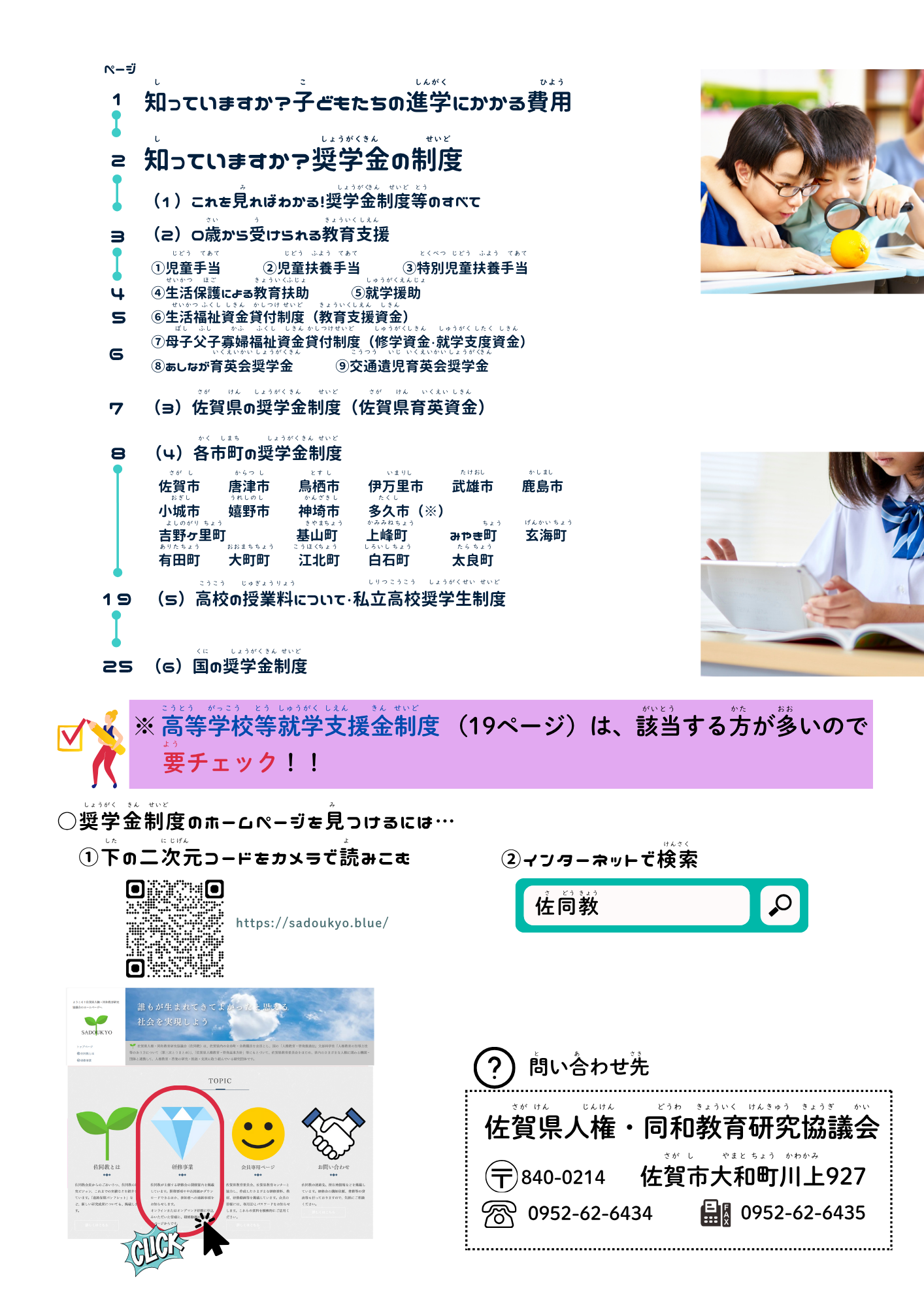 子どもたちの教育に必要な費用を、小学校入学時からまとめています。また、佐賀県で活用できる様々な奨学金等の支援制度をまとめています。学校での進路指導や家庭支援にご活用ください。