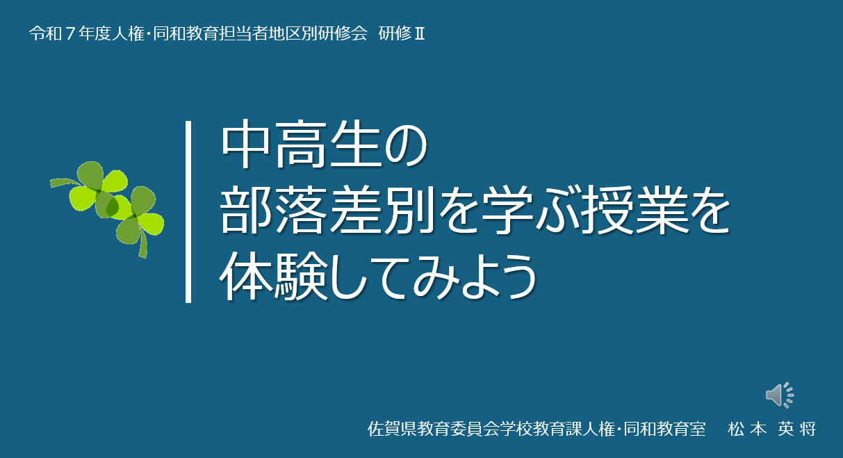 このページは、近年発生した学校における賤称語発言事象の課題に対応し、県教育委員会人権・同和教育室、佐賀県教育センター、佐賀県人権・同和教育研究協議会(佐同教)で開発されたさまざまな研修資料・教材を提供するページです。